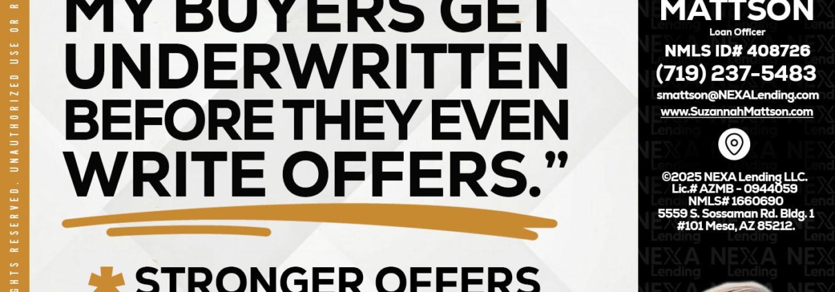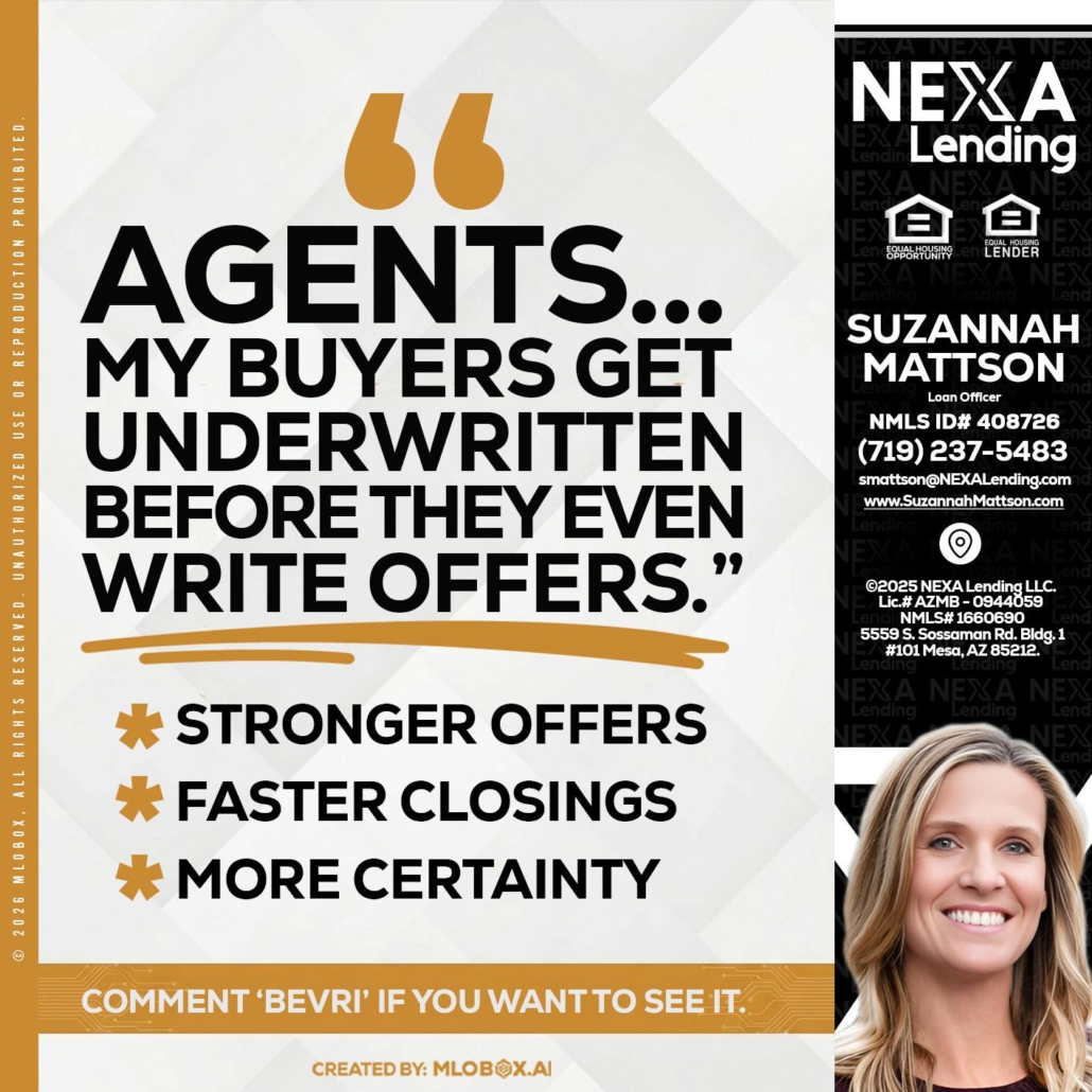 agents - Suzannah Mattson -Brokering Loan OfficerHi, my name is Suzannah Mattson. I’m a Loan Officer with NEXA Lending LLC., offering personalized mortgage solutions, fast customized quotes, great rates and service with integrity.