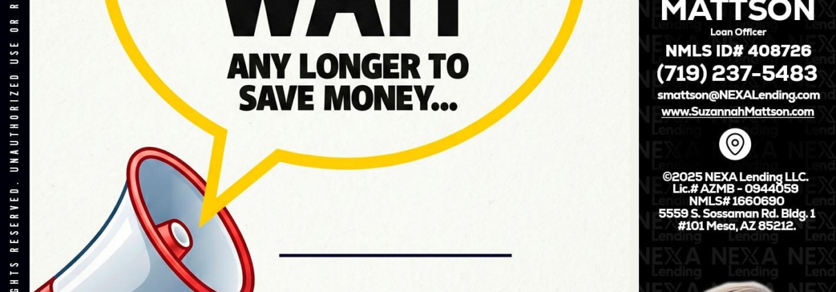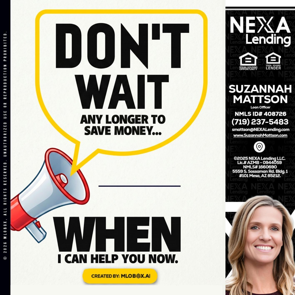DONT WAIT - Suzannah Mattson -Brokering Loan OfficerHi, my name is Suzannah Mattson. I’m a Loan Officer with NEXA Lending LLC., offering personalized mortgage solutions, fast customized quotes, great rates and service with integrity.
