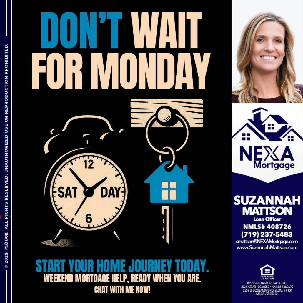 Hi, my name is Suzannah Mattson. I’m a Loan Officer with NEXA Mortgage LLC., offering personalized mortgage solutions, fast customized quotes, great rates and service with integrity.
