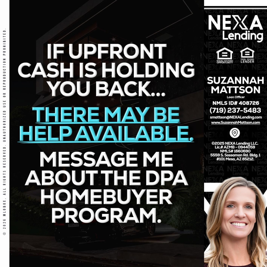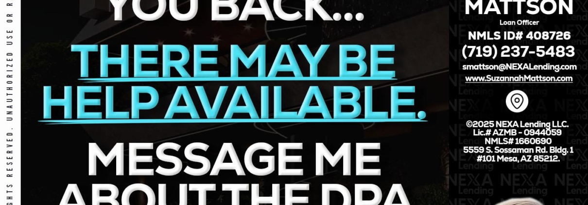 IF UPFRONT - Suzannah Mattson -Brokering Loan OfficerHi, my name is Suzannah Mattson. I’m a Loan Officer with NEXA Lending LLC., offering personalized mortgage solutions, fast customized quotes, great rates and service with integrity.