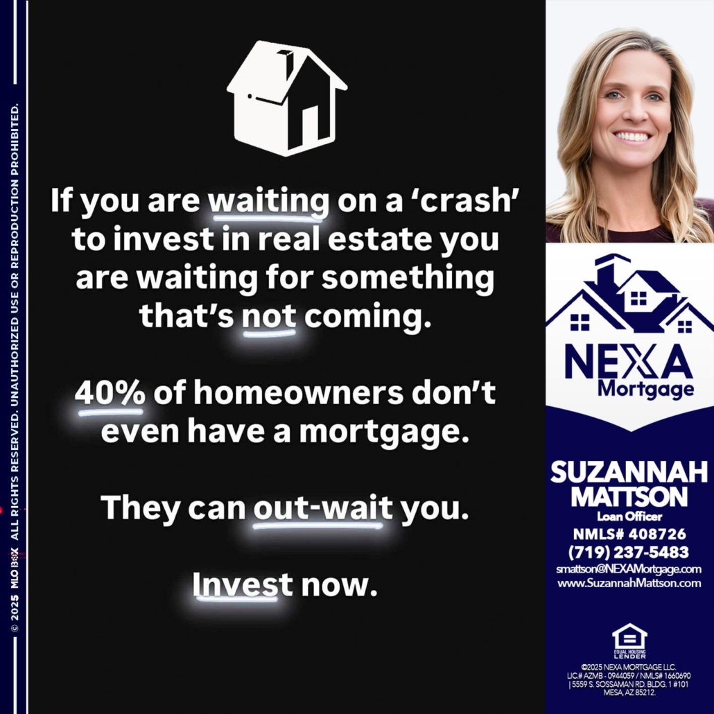 IF YOU ARE WAITING - Suzannah Mattson -Brokering Loan OfficerHi, my name is Suzannah Mattson. I’m a Loan Officer with NEXA Mortgage LLC., offering personalized mortgage solutions, fast customized quotes, great rates and service with integrity.
