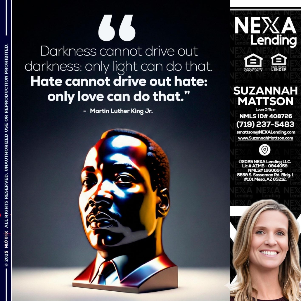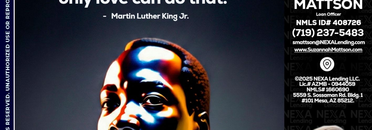 MLK 2026 - Suzannah Mattson -Brokering Loan OfficerHi, my name is Suzannah Mattson. I’m a Loan Officer with NEXA Lending LLC., offering personalized mortgage solutions, fast customized quotes, great rates and service with integrity.