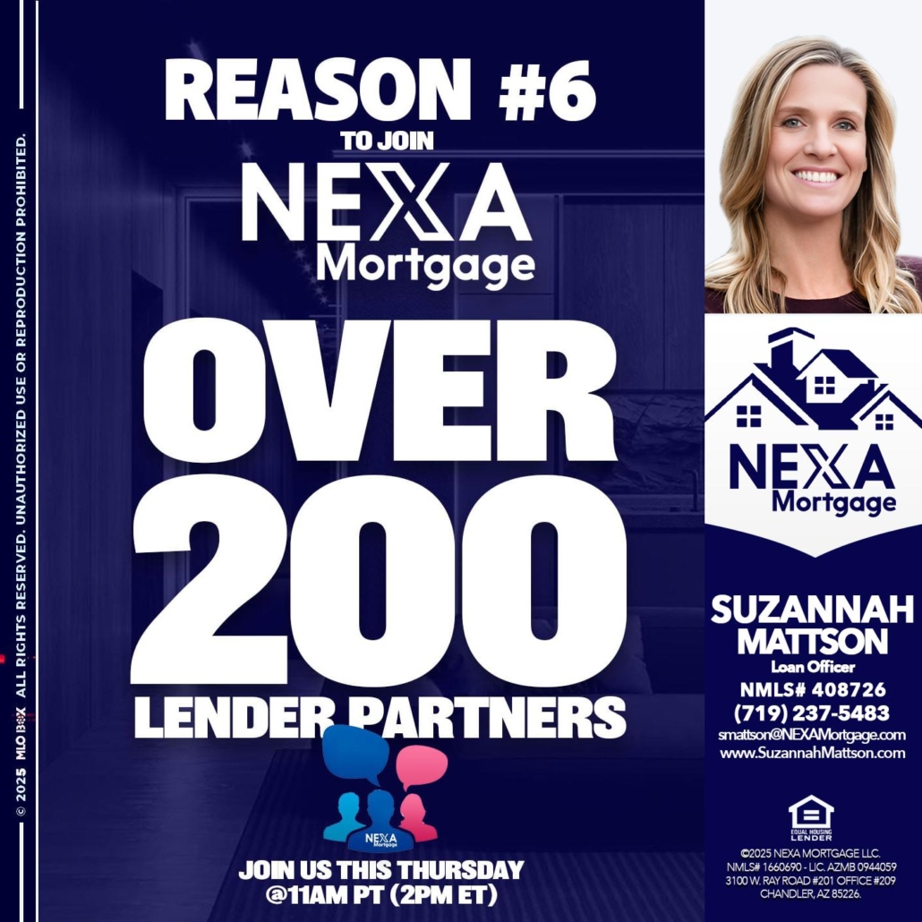 Hi, my name is Suzannah Mattson. I’m a Loan Officer with NEXA Mortgage LLC., offering personalized mortgage solutions, fast customized quotes, great rates and service with integrity.