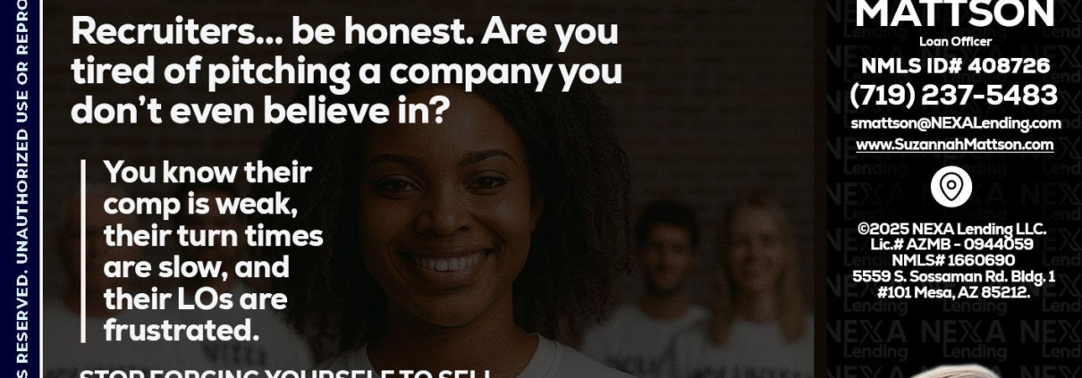 Hi, my name is Suzannah Mattson. I’m a Loan Officer with NEXA Mortgage LLC., offering personalized mortgage solutions, fast customized quotes, great rates and service with integrity.