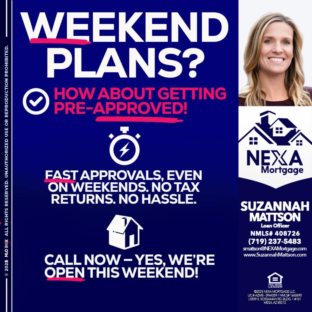 Hi, my name is Suzannah Mattson. I’m a Loan Officer with NEXA Mortgage LLC., offering personalized mortgage solutions, fast customized quotes, great rates and service with integrity.